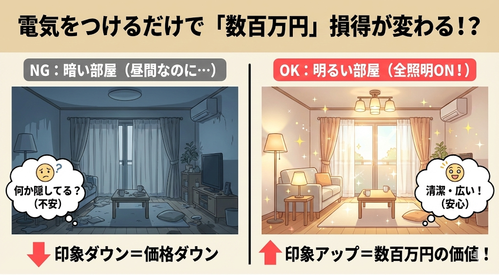 人間は本能的に「明るい場所=安全・清潔・広い」と感じ、「暗い場所=不安・狭い・汚い」と感じます。部屋が明るいだけで、物件の価格換算で数百万円分の価値向上に匹敵する印象を与えられます。逆に、薄暗い部屋は「何か欠陥を隠しているのではないか?」という無意識の疑念を生みます。電気代数十円をケチらず、光で満たしてください。