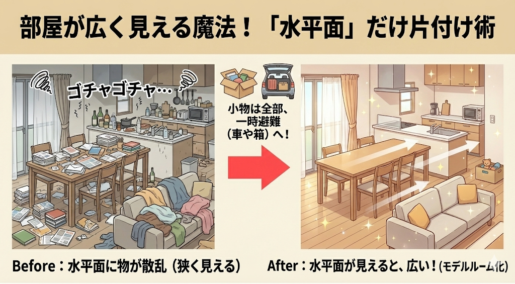 内覧の30分前だけで構いません。テーブルの上の物を、段ボールやスーツケース、あるいは自家用車のトランクに放り込んで「一時避難」させてください。収納の中を見られる可能性はありますが、テーブルの上が散らかっているより100倍マシです。