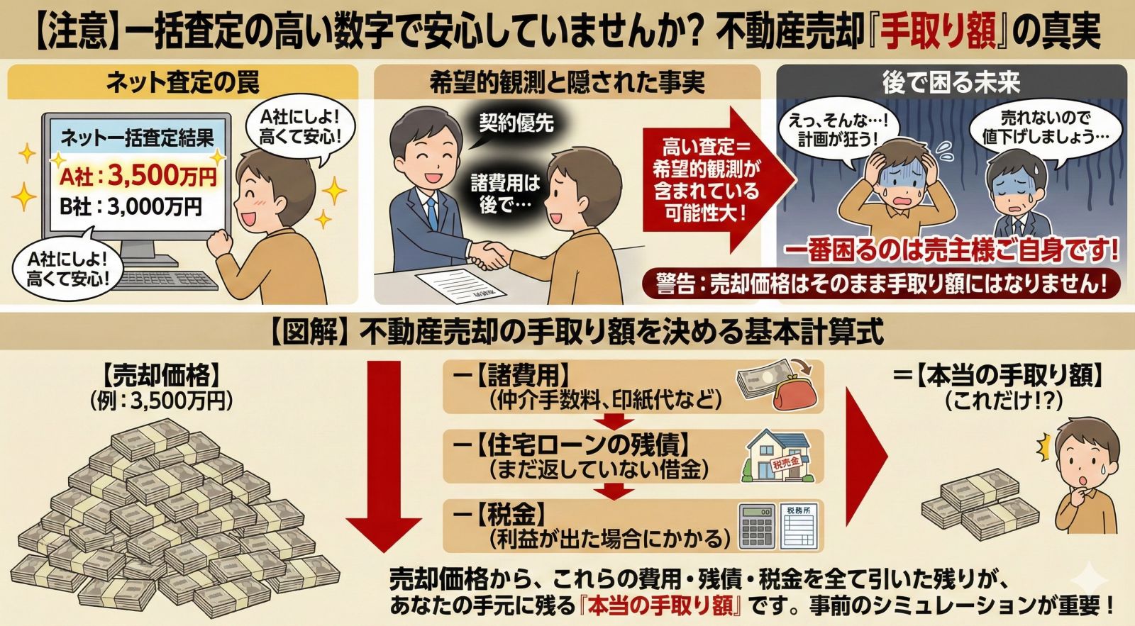 諸費用を引いたシビアな「手取り額」を最初に伝えないのは、売主様を不安にさせない配慮とも言えます。ただ、高い査定額を信じて進めた結果、後から「売れないので値下げしましょう」となって一番困るのは売主様ご自身です。