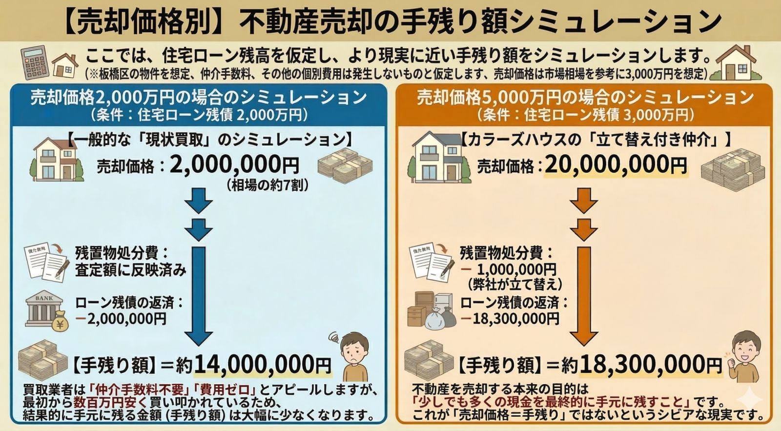 「現状買取」と「立て替え付き仲介」の手残り額シミュレーション