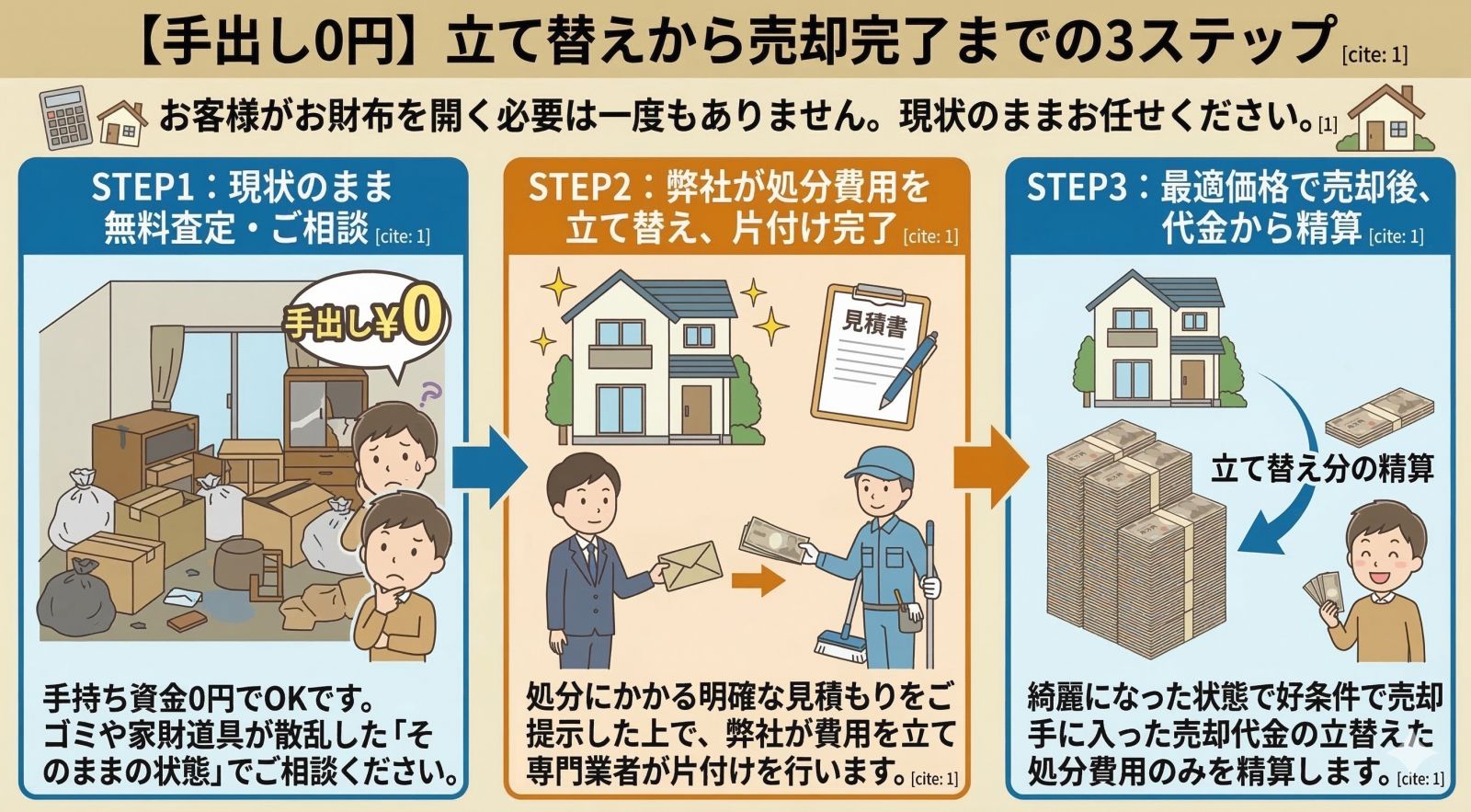 手持ち資金0円でOKです。ゴミや家財道具が散乱した「そのままの状態」でご相談ください。